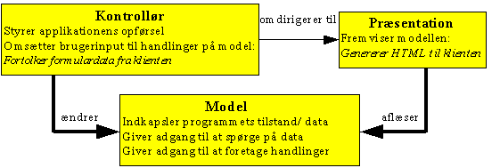 Kontrolløren er her lavet som JSP-siden kontrol.jsp. Den modtager alle forespørgsler, ændrer i objekterne og omdirigerer til en af de andre sider. De andre JSP-sider præsenterer data, som de aflæser fra objekterne og kender ikke til kontrolløren.