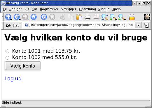 Når brugeren først er logget ind skal han, hvis han har flere konti, vælge hvilken konto han vil arbejde med. Det sker i vaelg_konto.jsp: