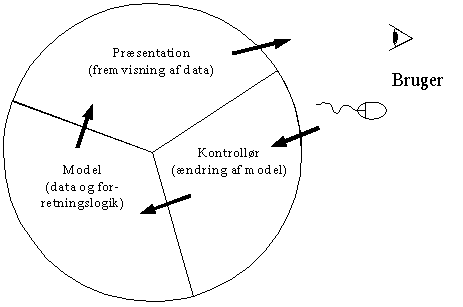 Brugeren foretager nogle handlinger (symboliseret ved musen), som via kontrolløren fortolkes som nogle ændringer, der foretages på modellen, hvorefter de nye data vises for brugeren.