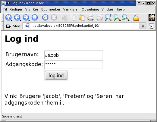 Først log_ind.jsp, hvor brugeren kan logge ind. Den genbruger Login-bønnen fra afsnit 9.5: