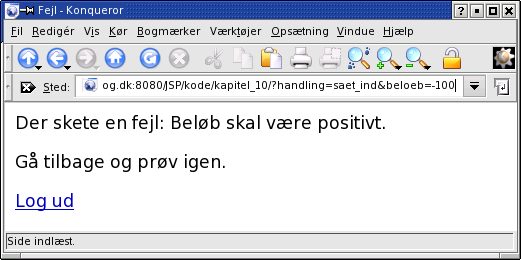 Indtaster brugeren noget forkert (f.eks. hæve et negativt beløb), opstår der en undtagelse (eng.: Exception) og siden fejl.jsp vises: