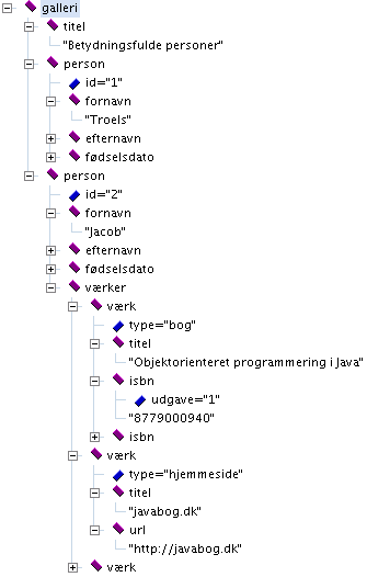 Her er 'roden' i træet <galleri>, som har 3 'grene' i form af underelementerne <titel>, <person> og <person>, som hver kan have flere underelementer.