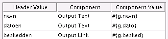 Dernæst skal vi beskrive hvad der skal vises i hver kolonne. Da vi har kaldt vores gennemløbsvariabel for 'g' er det den vi skal bruge. Da kolonnerne i databasen hedder hhv 'navn', 'dato' og 'besked' skriver vi hhv #{g.navn}, #{g.dato} og #{g.besked} (egentlig bliver det oversat til getString("navn"), getString("dato") og getString("besked") på ResultSet'et):