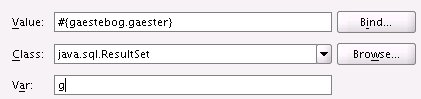 Nu kan vi lave en JSF-side med en <h:dataTable />, der viser gæsterne. Værktøjet spørger os om hvilken værdi der skal vises (det er #{gaestebog.gaester}, dvs metoden getGaester() på Gaestebog-objektet, der jo giver ResultSet-objektet) og om navnet på en variabel, der skal gennemløbe alle rækkerne.