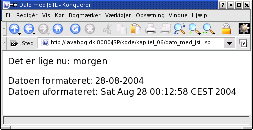 <% Date tid = new Date(); page.setAttribute("tid", tid ); // lav variablen 'tid' i JSTL %> Klokken er ${tid}