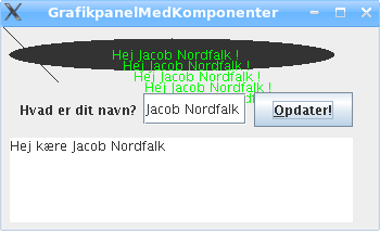 Her har vi tastet "Jacob Nordfalk" ind og trykket på "opdater!"-knappen (paintComponent() er ændret til også at tegne navnet 5 gange).