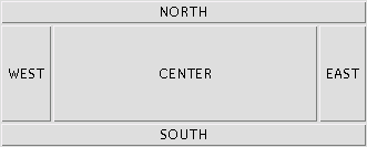 }Man sætter altså først layoutet ved at kalde setLayout() med et BorderLayout-objekt. Derefter kan add() kaldes med komponenterne og deres placering på borderlayoutet.