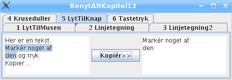 Det vigtigste interface til programmering af grafiske brugergrænseflader er ActionListener med metoden actionPerformed(). Den bruges bl.a. til at lytte til, om knapper bliver trykket på. Her er et eksempel, hvor den tekst, der er valgt med musen i et tekstområde, bliver kopieret til det andet tekstområde, når man trykker på knappen.