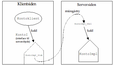 Lad os forestille os, at serveren har et konto-objekt, hvor man kan overføre penge, spørge om saldo og få bevægelserne. Disse metoder skal være tilgængelige over netværket, så vi definerer et fjerninterface til kontoen (her kaldt KontoI):