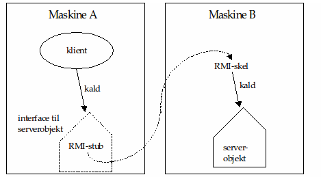 Herunder er tegnet, hvad der sker, når en klient på maskine A laver et kald til et serverobjekt (værts-objekt), der er i maskine B.