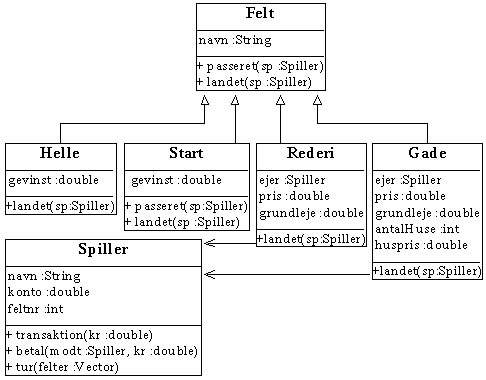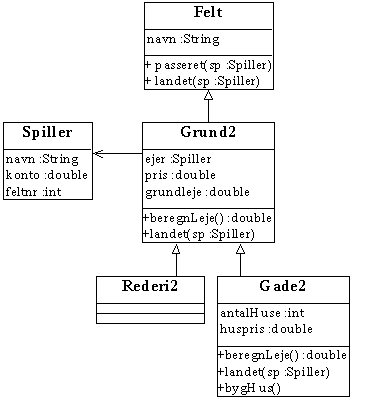 Herunder ses klassediagrammet for de nye klasser. Da Grund2 har en spiller (ejeren), er der en pil fra Grund2 til Spiller, en har-relation. Resten af pilene symboliserer er-en-relationer, f.eks. Gade2 er en Grund2, Grund2 er et Felt.
