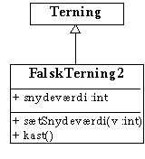 }I klassediagrammet er nedarvningen vist med en hul pil fra FalskTerning1 til Terning.