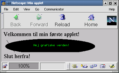 Herunder ses, hvordan HTML-koden med appletten ser ud i en netlæser (Netscape på Linux). Man ser, at først kommer HTML-teksten "Velkommen til ...", derunder appletten og nederst igen teksten "Slut herfra!" fra HTML-koden.