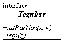 I UML-notation (tegningen til højre) er Tegnbar-interfacet tegnet med kursiv. Alle metoderne er abstrakte (= ikke implementerede) og er derfor også tegnet kursivt.