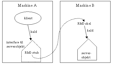 Herunder er tegnet, hvad der sker, når en klient på maskine A laver et kald til et serverobjekt (værts-objekt), der er i maskine B.