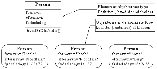 Objekter af samme klasse forstår de samme beskeder (kommandoer og spørgsmål) og indeholder samme slags data. Objekter af klassen Person indeholder f.eks. begge et navn, men navnene (data) i de to person-objekter, kan være forskellige.