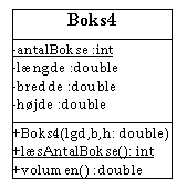 Det ses, at vi udefra kan kalde klassemetoder ved bare at angive klassenavnet og metodenavnet som i Boks4.læsAntalBokse(). Havde antalBokse været tilgængelig udefra (f.eks. erklæret public i stedet for private), kunne vi få fat i den udefra med Boks4.antalBokse.