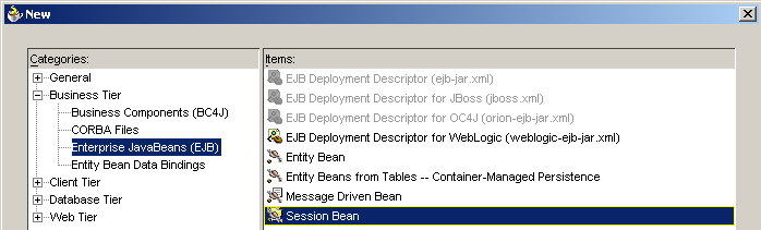 (File/New/Business Tier/Enterprise Javabeans (EJB)/Session Bean):
