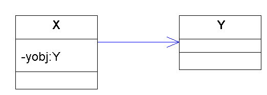 At X har Y betyder: i klassen X er defineret en variabel af type Y. Et X-objekt har derfor en reference til et Y-objekt, og derfor har X-objektet mulighed for at kalde metoder og bruge variabler fra Y-objektet gennem denne reference. Y-objekter kender ikke nødvendigvis noget til X-objekters eksistens.