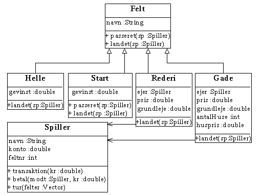 Klassediagrammer forudsættes kendt. Vigtige relationer mellem klasser er har-relationen og er-en-relationen. Eksempel (et matadorspil):