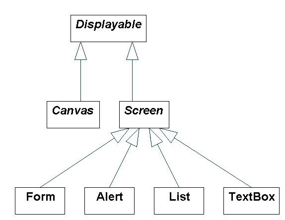 Det centrale element, når man skal designe brugergrænseflader, er et skærmbillede (en klasse, der arver fra Displayable). Et skærmbillede er et objekt, som viser grafik og tager imod indtastninger fra brugeren. Der kan kun være ét skærmbillede synligt ad gangen.