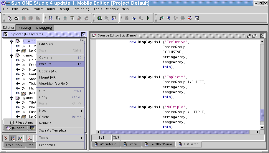 Når udviklingsmiljøet startes, dukker en række eksempler på midletter op, parat til at køre og med kildetekst, så man kan se hvordan forskellige ting programmeres. Højreklik f.eks. på den, der hedder 'UIDemo', og vælg 'Execute' (som vist på figuren ovenfor), og en telefon dukker op med midletten kørende inden i.
