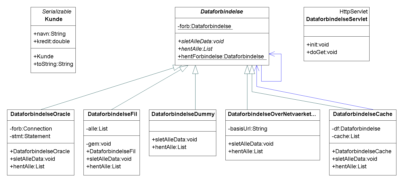 import java.util.*; public abstract class Dataforbindelse { abstract public void sletAlleData() throws Exception; abstract public void indsæt(Kunde k) throws Exception; abstract public List hentAlle() throws Exception; // fabrikeringsmetode synchronized public static Dataforbindelse hentForbindelse() throws Exception { // - her implementeret som en Singleton if (forb != null) return forb; // ... her skal kode ind der skaffer en forbindelse forb = new DataforbindelseDummy(); // lige nu //forb = new DataforbindelseOracle(); // senere //forb = new DataforbindelseOverNetvaerketTilEnServlet(); // endnu senere!! return forb; } private static Dataforbindelse forb; }