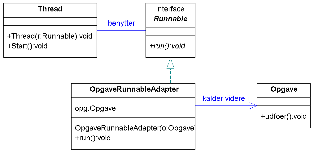 public class OpgaveRunnableAdapter implements Runnable { Opgave opg; OpgaveRunnableAdapter(Opgave o) { opg = o; } public void run() { opg.udfør(); // Oversæt kald af run() til kald af udfør() } }