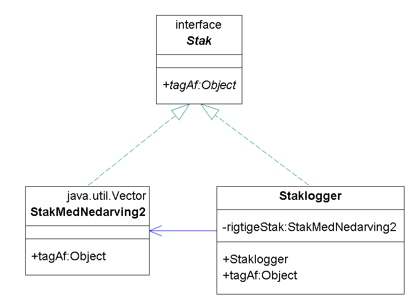 Bemærk, at i dette simple eksempel refererer StakLogger til en StakMedNedarving2-klasse. Man kan gøre StakLogger mere generelt anvendeligt ved at referere til Stak-interfacet i stedet (jvf. afsnit 15.3).