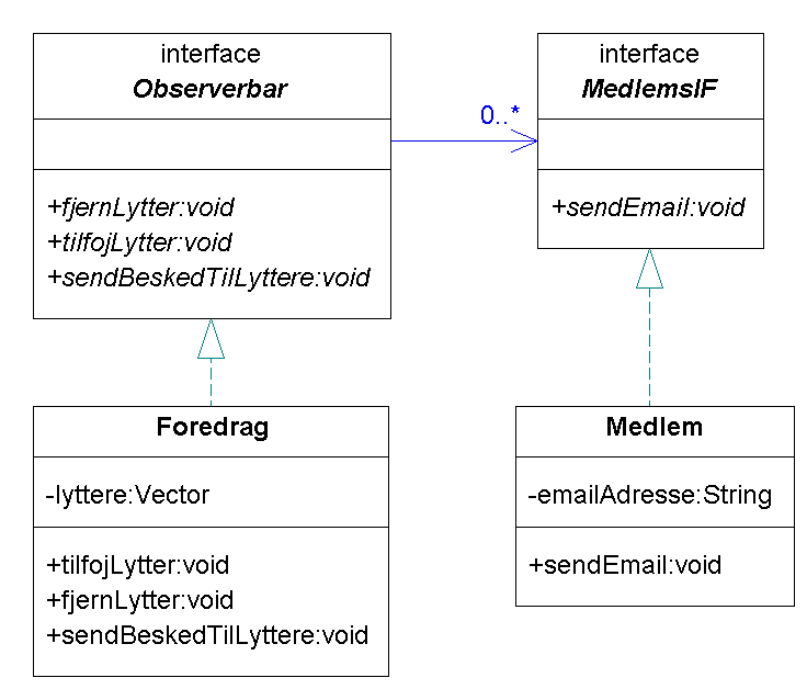 Det kan implementeres ved at lave et foredragsobjekt, som indeholder en liste af registrerede lyttere. Objektet har metoder til at tilføje og fjerne lyttere og til at løbe listen igennem og sende beskeder, når det er nødvendigt.