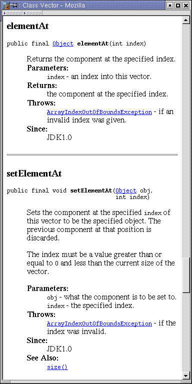 Fortsætter vi i kildeteksten til Vector (der findes samlet i afsnit 1.6.8), kan vi se, hvordan javadoc genererer HTML-kode (vist til højre) ud fra beskrivelsen af metoderne og specielle javadoc-koder (beskrevet i afsnit 2.3.2) som @param, @return, @exception, @since og @see:
