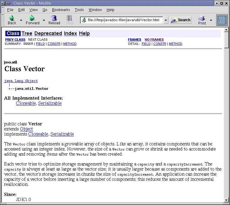 Da Vector-klassen er velkendt for de fleste, er den valgt til at illustrere sammenhængen mellem javadoc-kommentarerne i kildetekst og den genererede HTML-dokumentation: