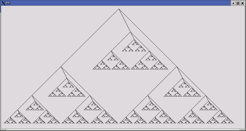 import java.awt.*; public class Fraktaltrae extends Frame { /** * Tegner et fraktalt træ. Hver gren er i sig selv et træ. * @param x x-koordinaten hvor træets rod skal tegnes * @param y y-koordinaten hvor træets rod skal tegnes * @param dx x-forskydning fra rod til træets første forgrening * @param dy y-forskydning fra rod til træets første forgrening * @param str træets størrelse * @param g Graphics-objektet */ public void tegnGren(Graphics g, int x, int y, int dx, int dy, int str) { if (str < 1) return; // vi vil ikke tegne forsvindende små grene g.drawLine(x, y, x+dx, y+dy); // tegn stammen tegnGren(g, x+dx, y+dy,-str/2, str/2, str/2); // tegn gren til venstre tegnGren(g, x+dx, y+dy, str/10,str/5, str/3); // lille gren lidt til højre tegnGren(g, x+dx, y+dy, str/2, str/2, str/2); // tegn gren til højre } public void paint(Graphics g) { tegnGren(g,410,30,0,0,400); } public static void main(String[] arg) { Fraktaltrae træ = new Fraktaltrae(); træ.setSize(850, 450); træ.setVisible(true); } }